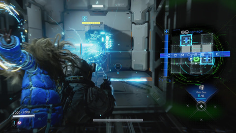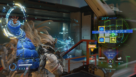 しかし本作は、セクターの道中で入手できる強化素材やポイントを使ってシェルターでヒューのスーツや武器、ディアナのハッキング能力を強化することができる。筆者はハッキングを重点的に強化していったのだが、強化の段階を重ねるにつれてサブと思っていたハッキングが強力な武器へと変わった。
