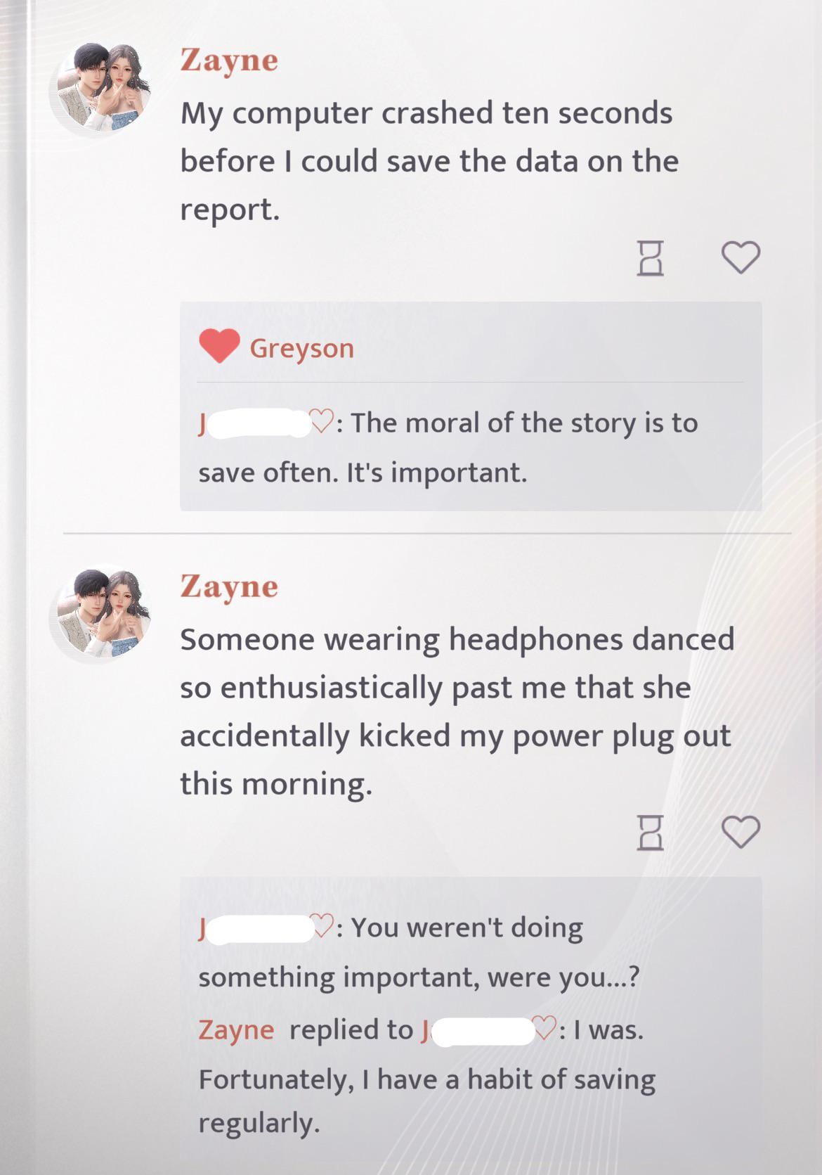 物事がただ並んでいるのが大好きです、時々偶然が起こるととても面白いです HAHA ゼインから基本的にMCはポンコツだから定期的にセーブしてるって投稿が来たんだけど、次に受け取る投稿はコンピューターがクラッシュしたって言ってるやつだった(笑) MCが彼をからかう、保存しておけばよかった😂😂 面白すぎるよLOOOOL by jazoodles