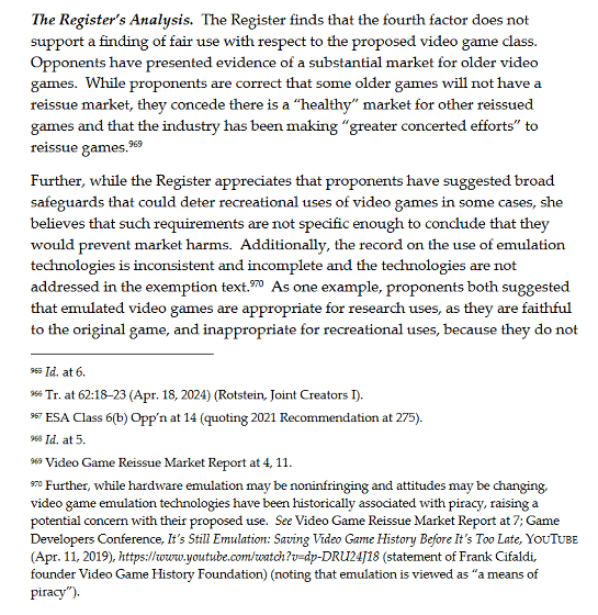 アメリカ著作権局はVGHFの要請を拒否した理由について「一部のレトロゲームに再販売市場が存在しないという主張は正しい。しかし、他のレトロゲームには『健全な』市場が存在しており、ゲーム業界はゲームを再販売するために『より協調した努力』を行っている」「VGHFがレトロゲームへの娯楽目的のアクセスを抑制する広範な安全措置を提案していることは評価できる。しかし、VGHFの安全措置は市場の被害を防止できると結論付けられるほど具体的ではない」と説明しています。